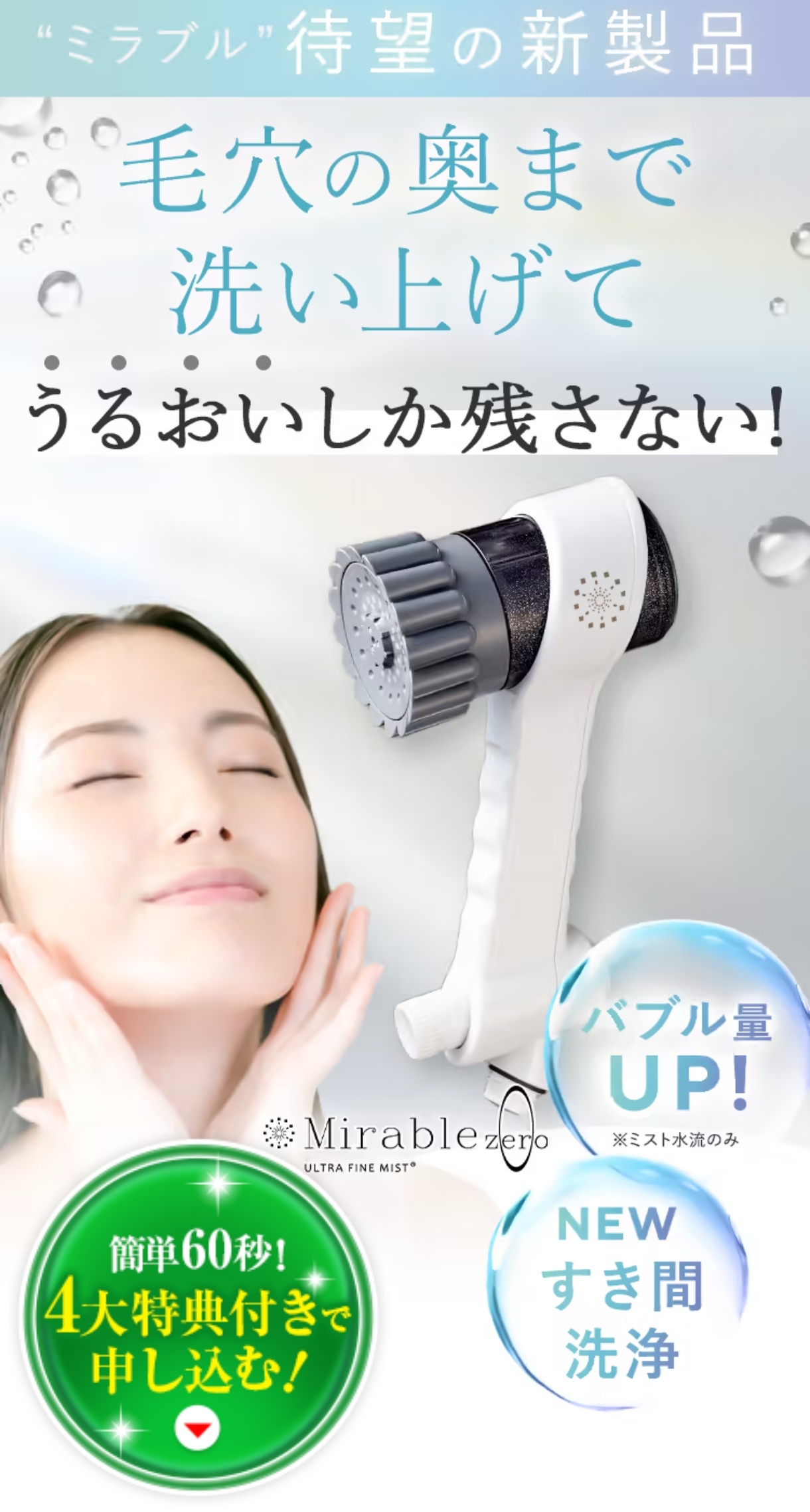 最大の特徴は、目に見えないほど微細な気泡「ウルトラファインバブル」を生成する独自の技術です。ミラブルzeroは、これまでの洗浄力に加え、新たに「口腔ケア」や「隙間洗浄」といった概念を取り入れました。ただ水を浴びるだけでなく、肌の水分量を整え、毛穴の奥の汚れを吸着して落とす。その圧倒的なテクノロジーの裏付けがあるからこそ、美容意識の高い層だけでなく、健康や清潔感を重視する幅広い世代から絶大な支持を得ています。